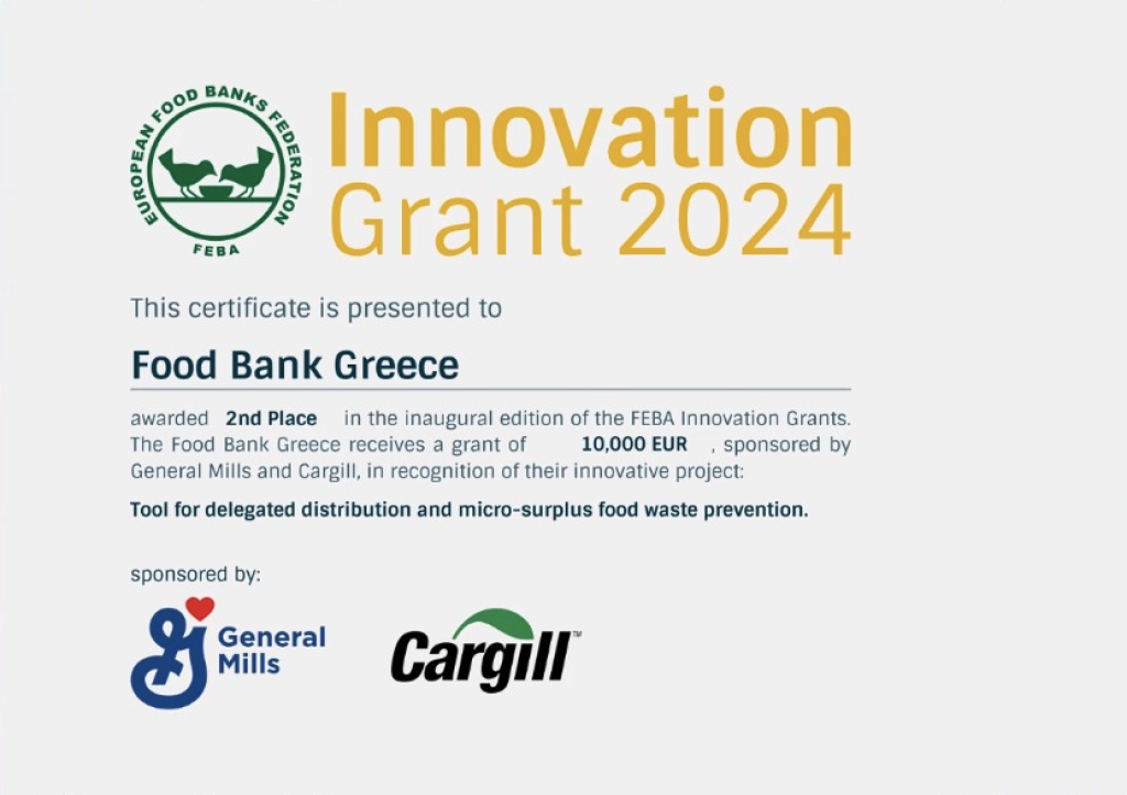 Η πλατφόρμα αναπτύχθηκε με την χρηματοδότηση της Ομοσπονδίας Ευρωπαϊκών Τραπεζών Τροφίμων (FEBA) αποσπώντας το 2ο βραβείο στον διαγωνισμό "Innovation Grant 2024" ανάμεσα σε πολλές προτάσεις τραπεζών τροφίμων και από άλλες χώρες της Ευρώπης.